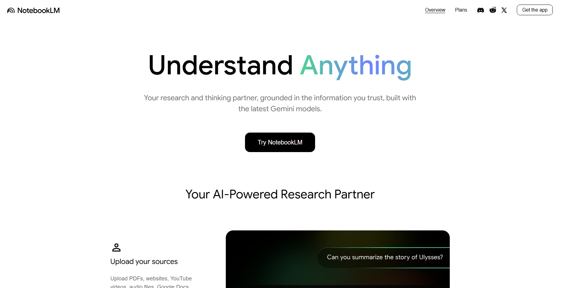 Upload PDFs, notes, or YouTube links, and ask questions strictly based on those documents. Excellent for research with verifiable answers. Generates study podcasts (Audio Overviews).