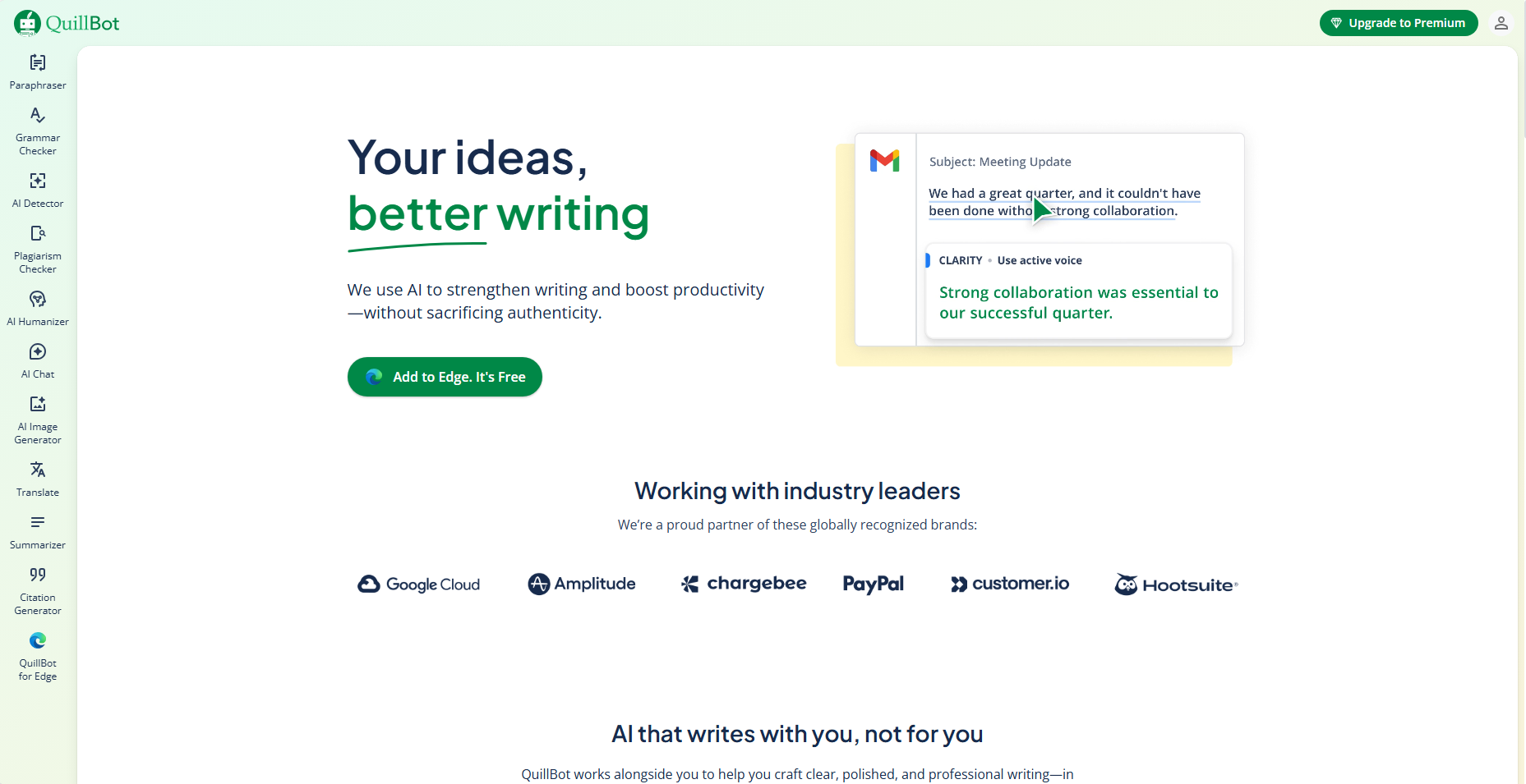 Grammarly offers comprehensive writing support and integrity checks through its plagiarism and AI detector tools. It is highlighted for its ease of use across browsers and documents.