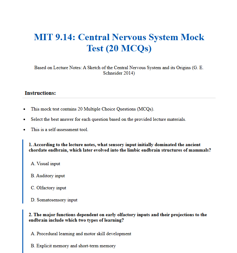 Input was a 60-page lecture PDF on The Neural Tube Forms in the Embryo. TheBar AI quickly structured 20 high-quality multiple-choice questions (MCQs), 5 short-answer questions, and provided a comprehensive answer key based on the document's content. Ideal for self-assessment and simulated test environments.