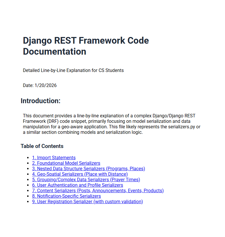 A computer science student uploaded 200 lines of complex Python code. TheBar AI not only summarized the code's function and intent but provided line-by-line breakdown documentation and identified potential runtime optimization areas, significantly speeding up project review time.